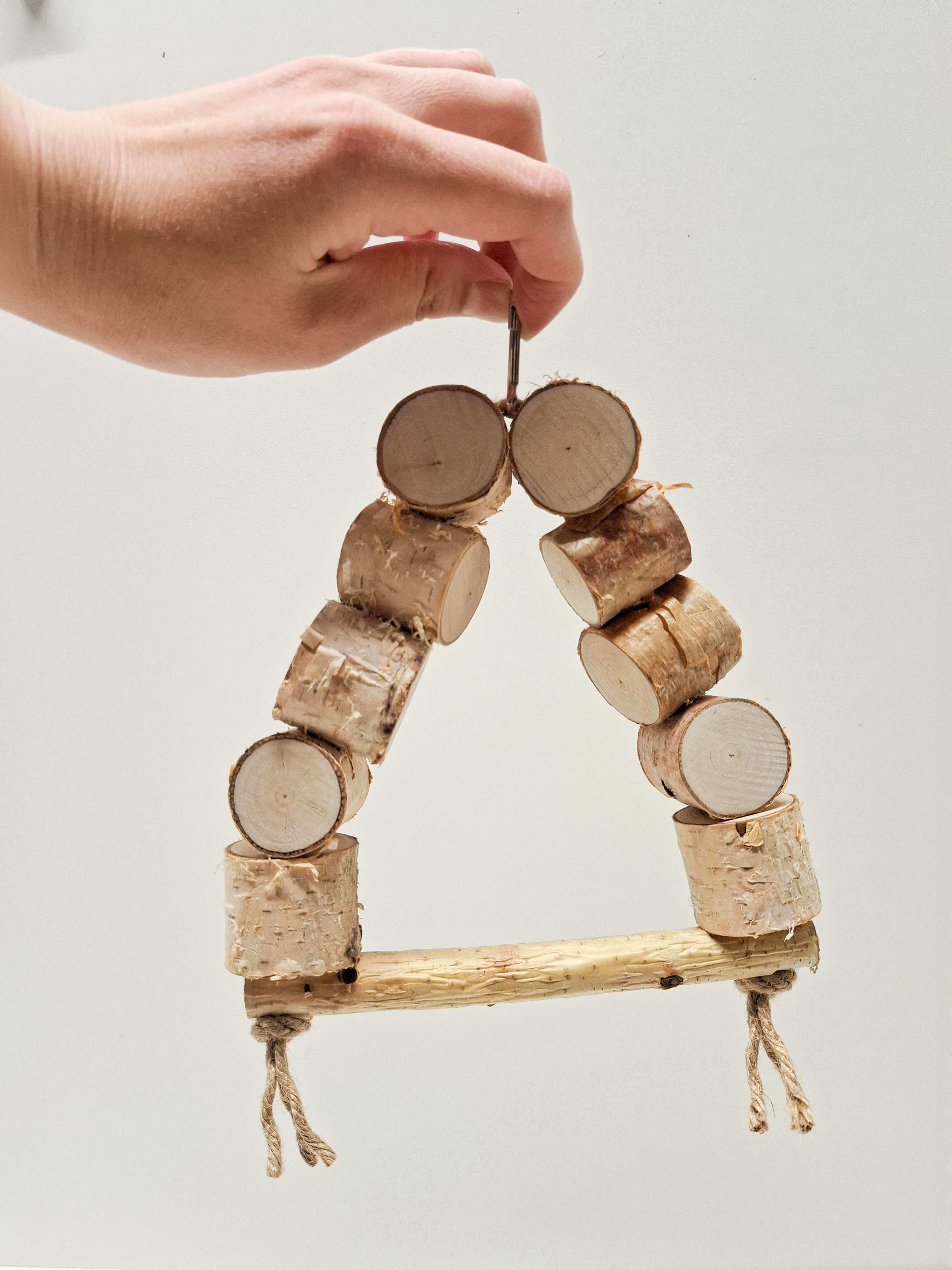 Размеры качели: высота - 17 см, жердочка - 15 см, толщина спилов 3см.