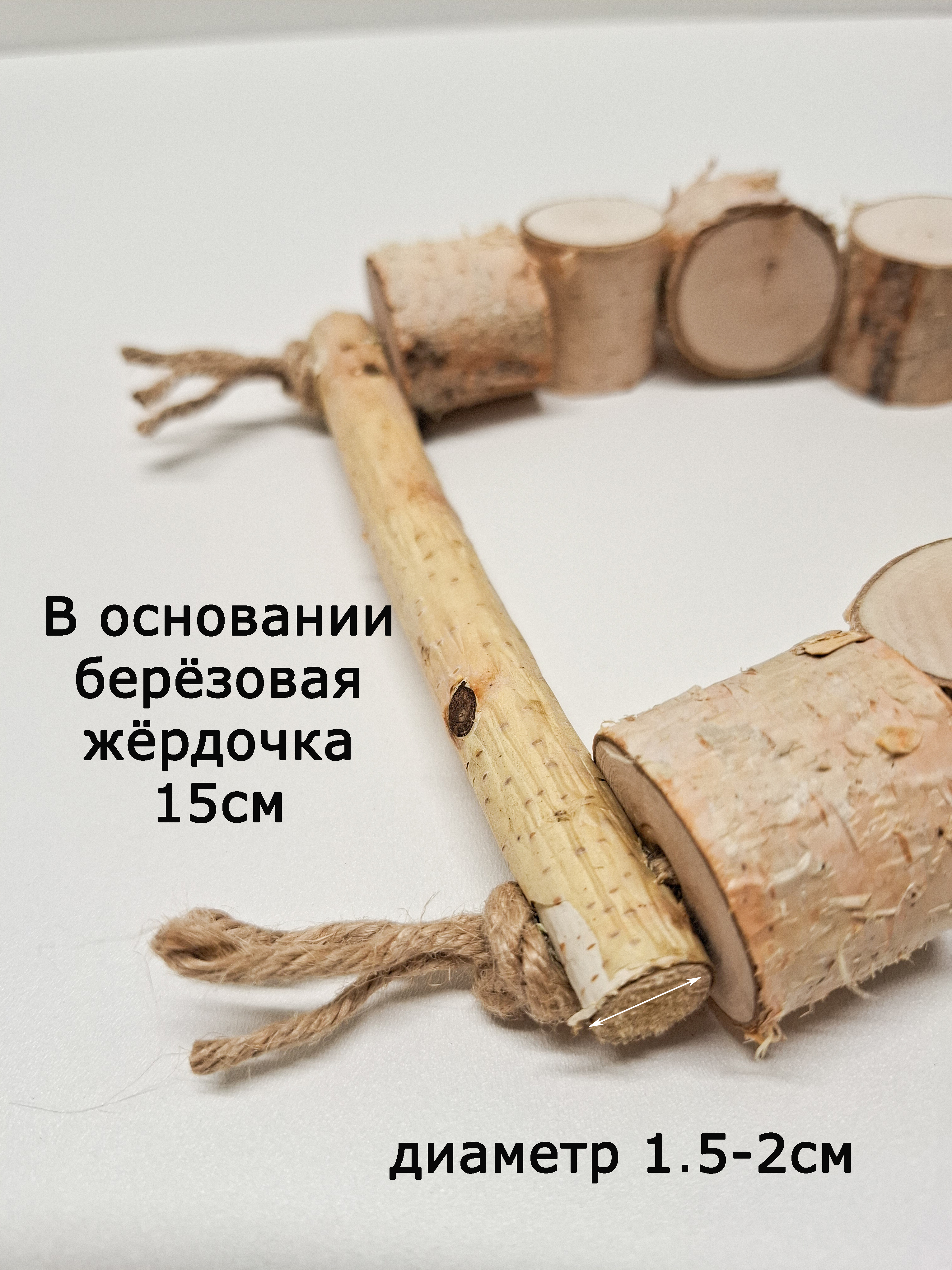 Качели изготавливаются из натуральных материалов: джутового каната, берёзовых спилов и жердочки с корой, без использования клея. Диаметр жердочки в диапазоне 1,5-2 см. Каждая ветка уникальна и может отличаться от фото. Цвет берёзовой коры может быть не только белым, но и серо-коричневым, коричневым, желтоватых оттенков.
