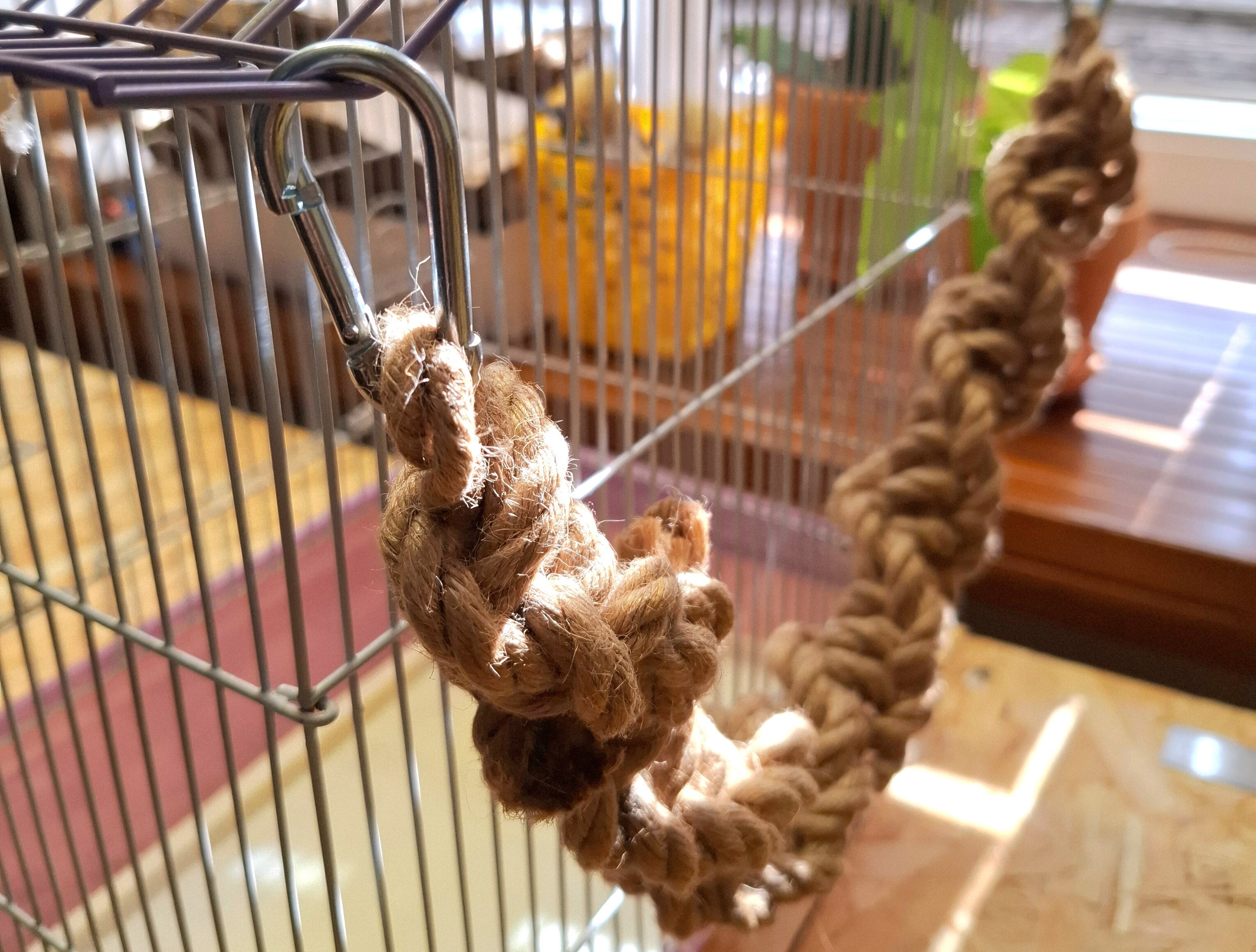 Гибкая жердочка легко устанавливается, в качестве крепления к клетке используются металлические карабины 5 см. Внутри каната нет проволоки и склеенных элементов. Размер: (без крепления) длина каната для птиц 50 см, 5 см диаметр. Джутовый аксессуар в клетку подойдёт для средних и крупных попугаев.