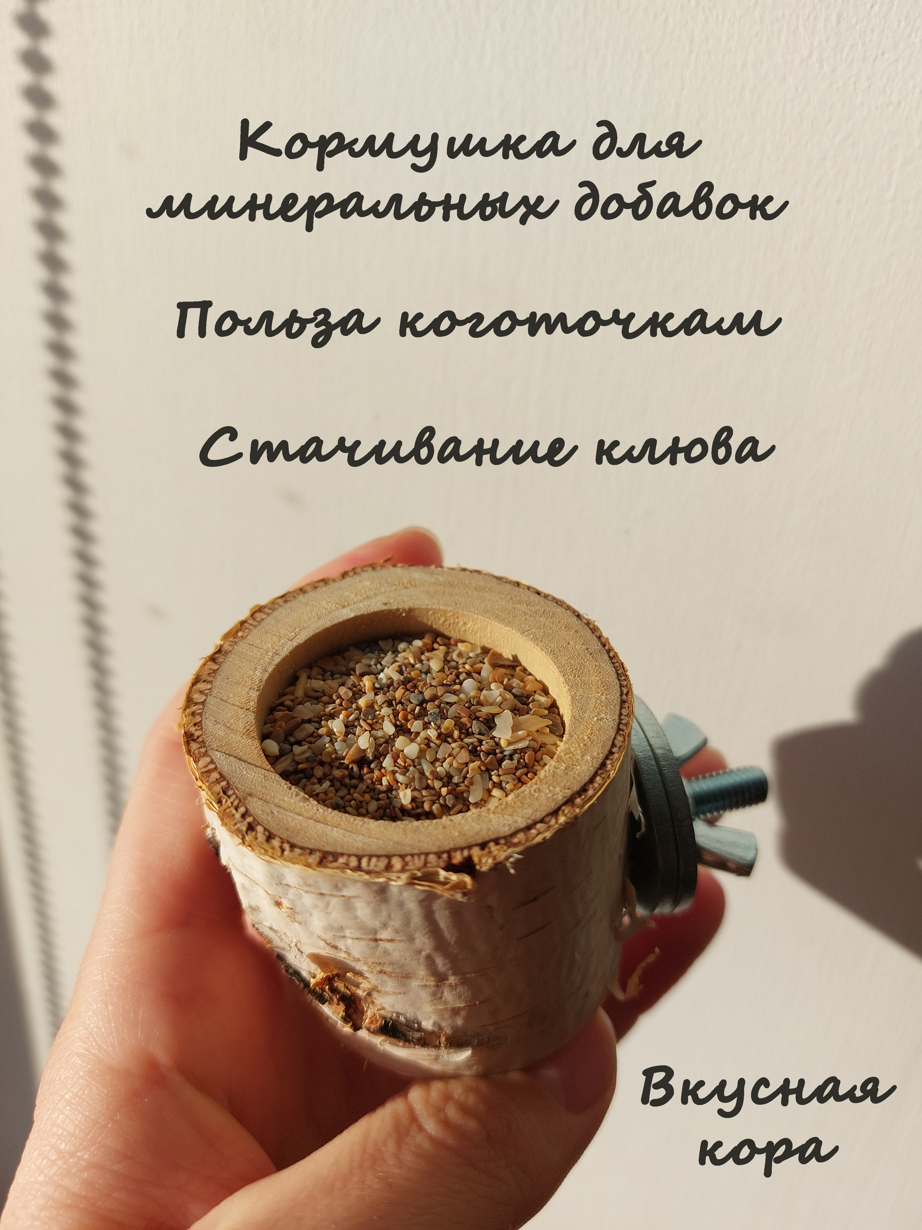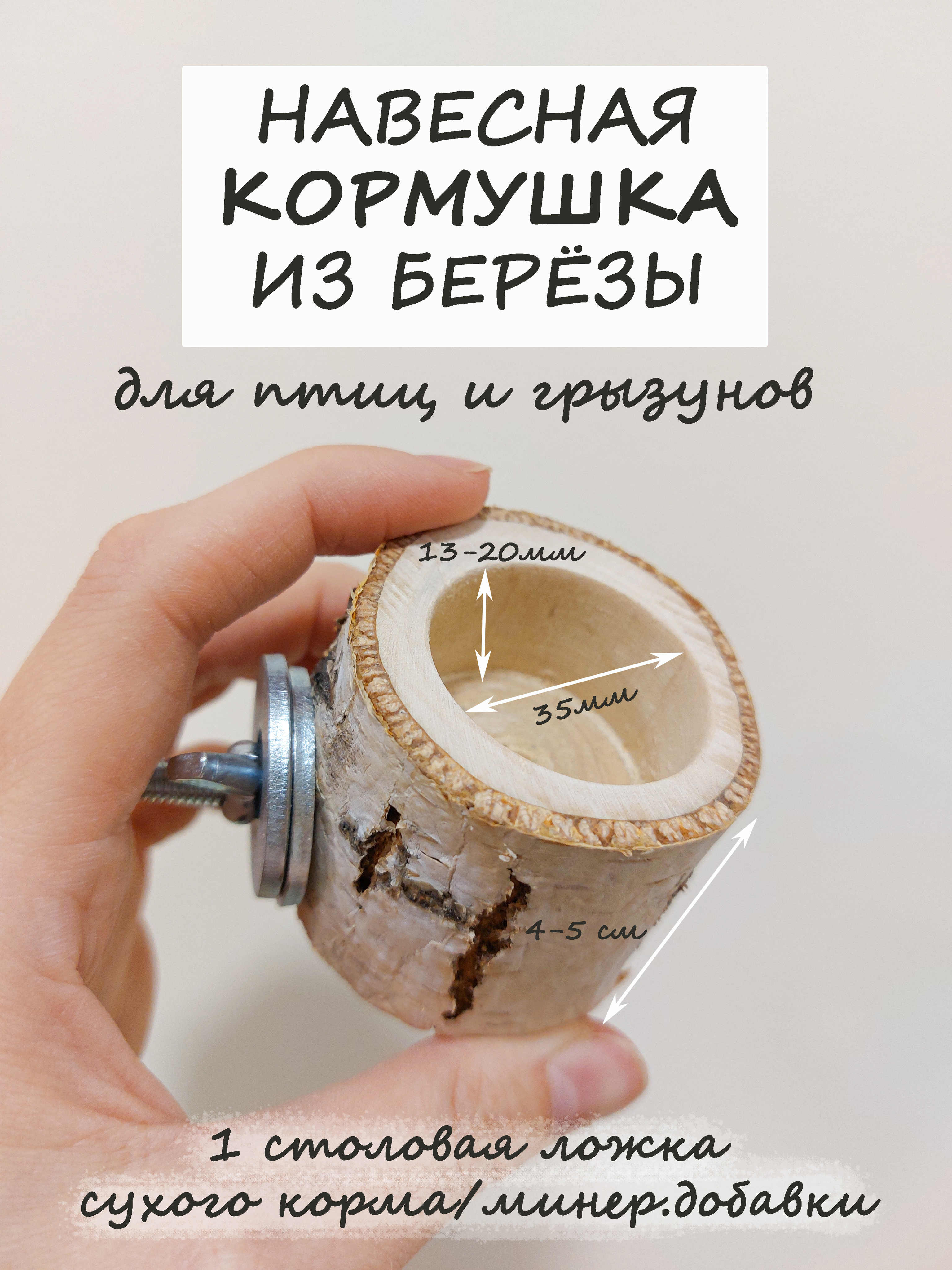 Деревянная кормушка для небольших птиц и грызунов. Насыпьте столовую ложку сухого корма/зерносмеси, минеральной добавки в кормушку и питомец оценит необычную подачу. Кормушка универсальна, перевернув, её можно использовать как присаду. Кормушка для попугаев и грызунов изготавливается из натурального березового спила с корой. В качестве крепления к клетке используются металлический барашек и шайбы 3 см, без применения клея и обработки дерева. Диаметр кормушки из дерева 4,5-6 см, высота 4-5 см, диаметр отверстия под корм 35мм, высота 13-20мм.