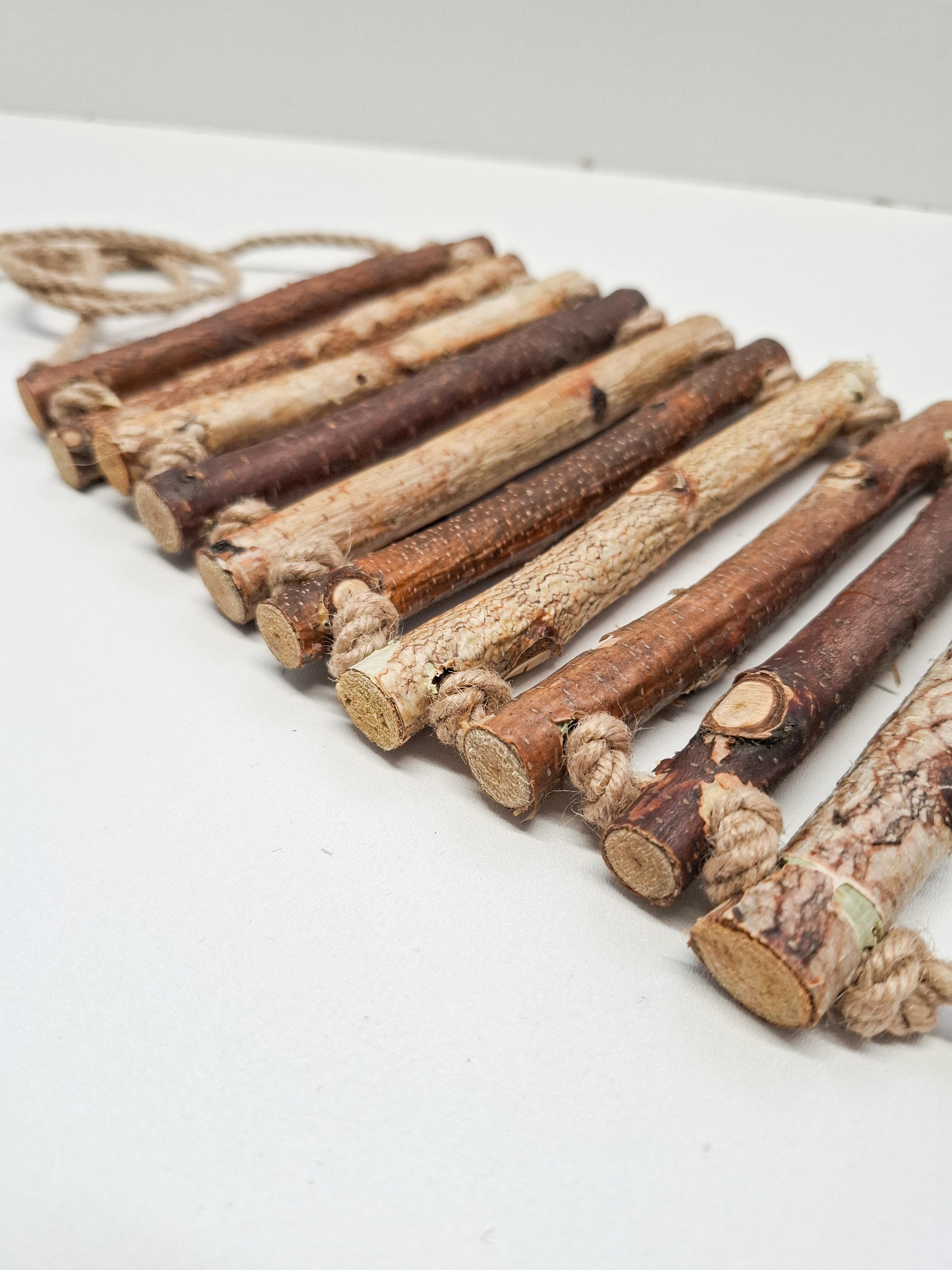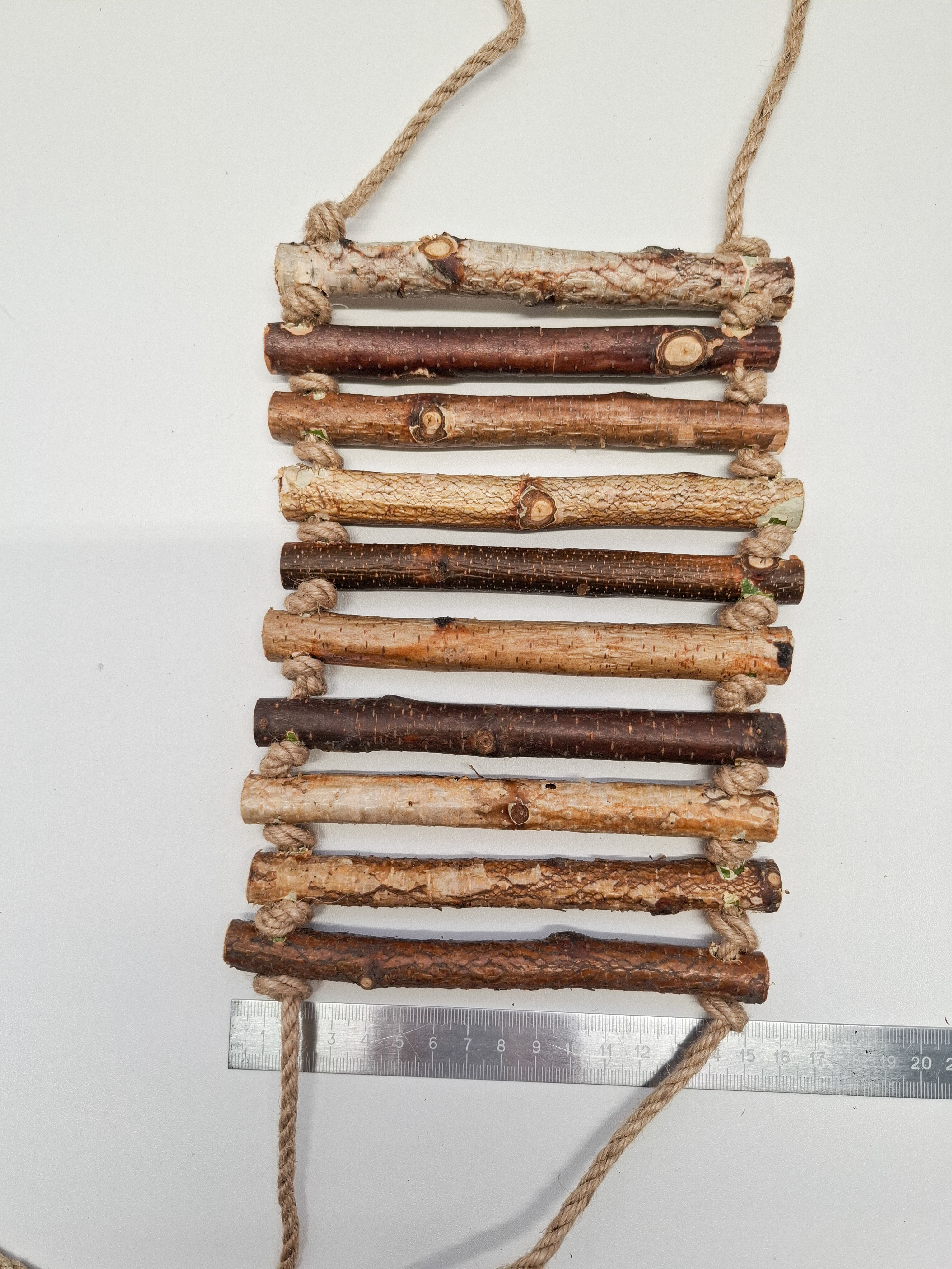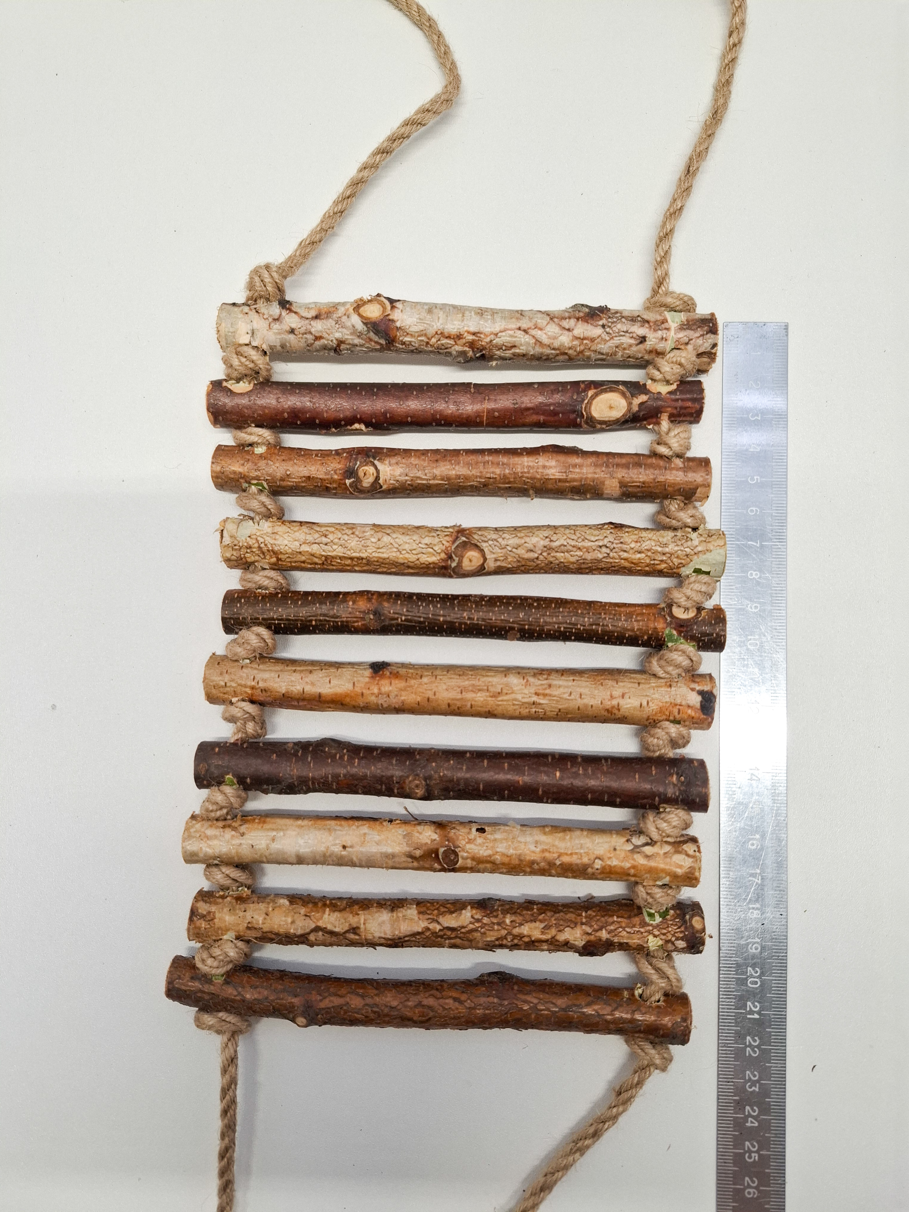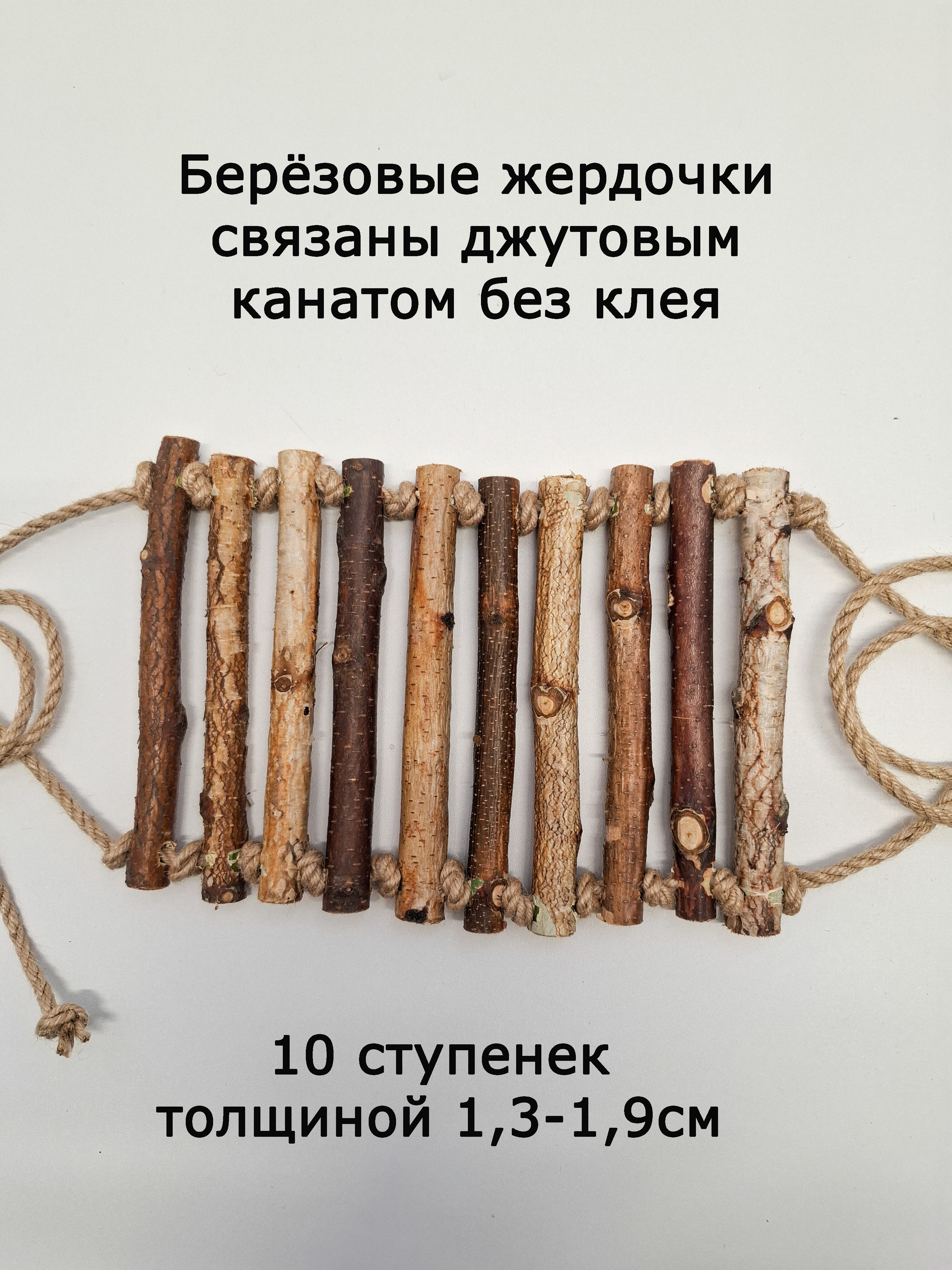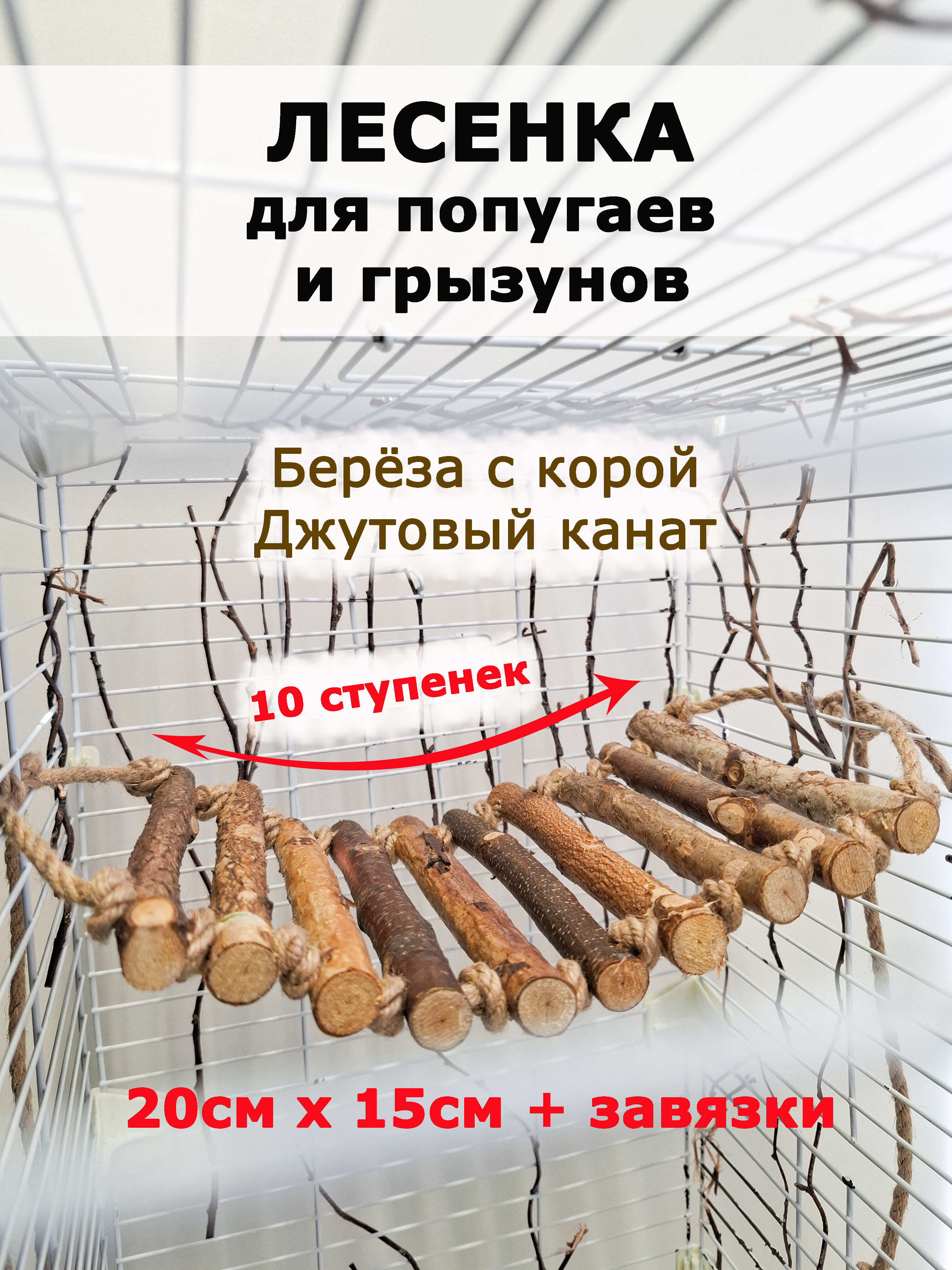 Игрушка для попугаев и грызунов состоит из 10-ти березовых ступенек с корой толщиной 1.3-1.9см. Размеры деревянной части 20см +-1.5см / 15см.